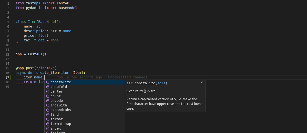 In your editor, inside your function you will get type hints and completion everywhere (this wouldn't happen if you received a dict instead of a Pydantic model):